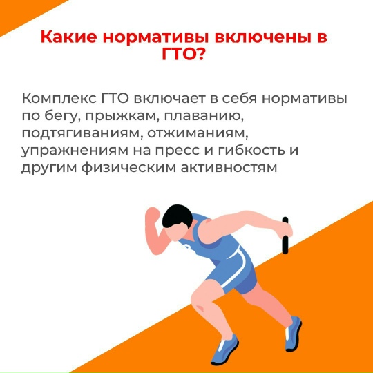 ГТО (Готов к труду и обороне) – это уникальная возможность оценить свою физическую подготовку и сделать осознанный выбор в пользу здорового образа жизни. Участие в программе осуществляется на добровольной основе и может послужить отличным стимулом для регулярных занятий спортом. Основные цели и задачи комплекса ГТО: • Популяризация и продвижение ценностей здорового образа жизни в обществе. • Повышение общего уровня физической подготовленности населения. • Формирование патриотического сознания и гражданской ответственности. • Выявление перспективных и талантливых спортсменов. Как стать участником ГТО: 1. Необходимо зарегистрироваться на официальном портале gto.ru и подтвердить свою учетную запись на портале «Госуслуги». Подробная информация по ссылке: clck.ru/3NjVWP 2. Оформите заявку на прохождение испытаний, соответствующих вашей возрастной категории. 3. Выполните установленные нормативы в одном из аккредитованных центров тестирования. Программа ГТО включает в себя разнообразные испытания, направленные на оценку ключевых физических качеств: силы, выносливости, гибкости и скорости. Результаты выполнения нормативов фиксируются в личном кабинете участника на сайте, что позволяет отслеживать динамику личного прогресса и получать заслуженные награды за успешное прохождение испытаний. Не упустите возможность присоединиться к масштабному спортивному движению! Подтвердите свою готовность к труду и обороне, став частью команды ГТО!